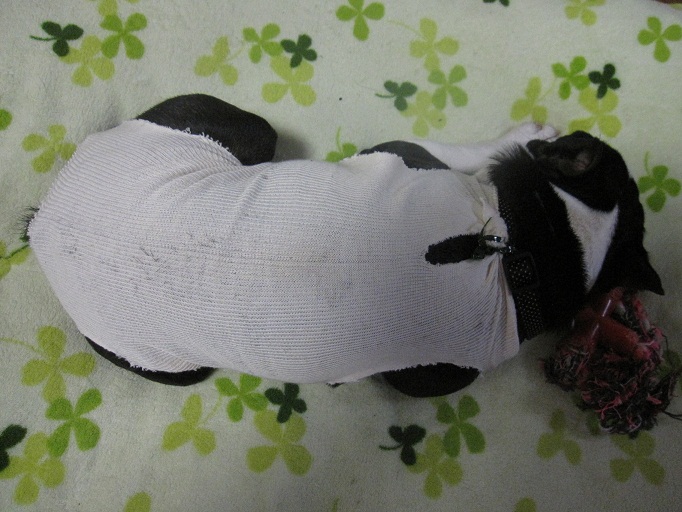 私もこのブリちゃんが来ている謎の布に驚きました。くーちゃんの時はエリザベスカーラーのみだったのに。